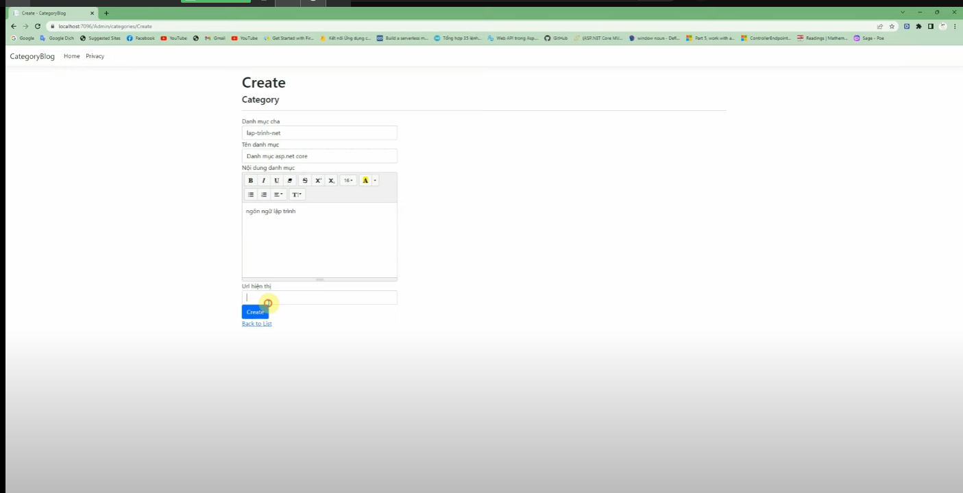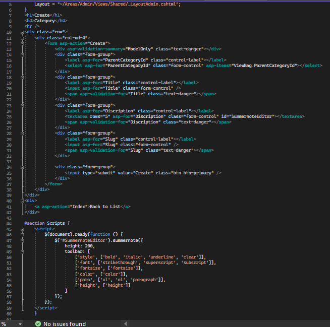 Mở file Areas/Admin/Views/Category/Create.cshtml thêm vào đoạn mã kích hoạt Summernote cho phần tử Content - nó thành như sau: